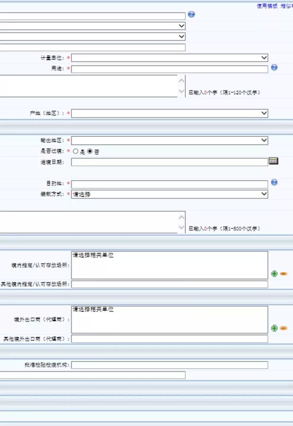 9、“境内指定认可存放单位”“其它境内指定认可存放单位”。进境肉类、水产品等须在境内指定存放场所存放的产品,必须从下拉列表中选择。其它产品填写在“其它境内存放单位”一栏。