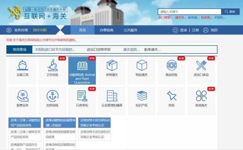 在“互联网+海关”登录,并在动植物检疫模块下选择相应的类别,网址:http://online.customs.gov.cn/