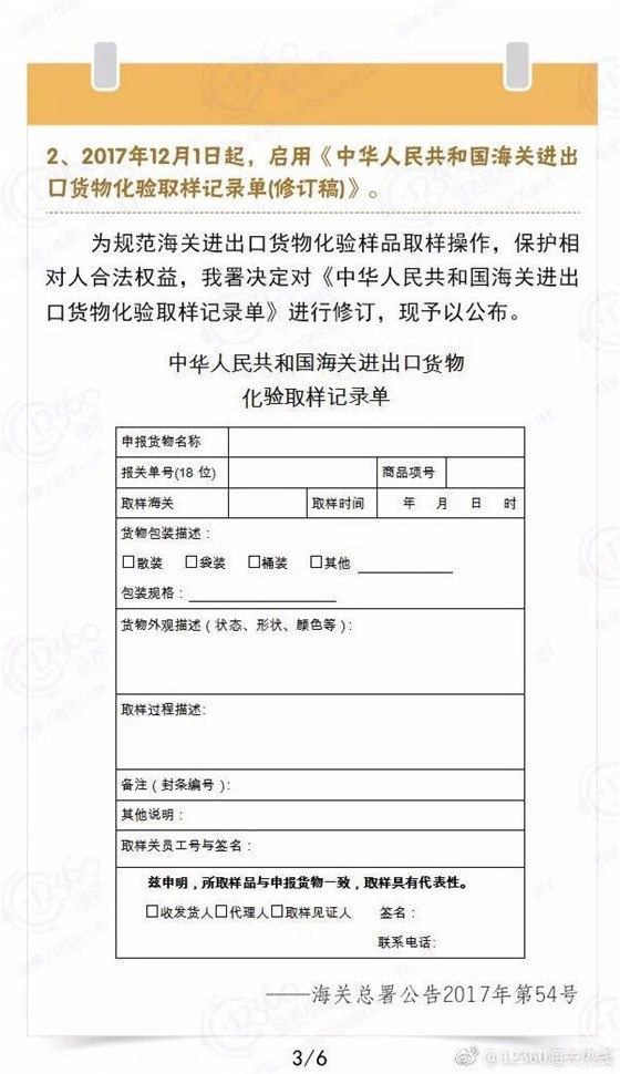 2、启用修订版《中华人民共和国海关进出口货物化验取样记录单》。