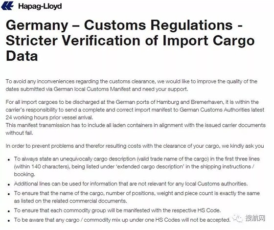 据消息获悉,德国海关将更严格的对进口货物数据进行核查。船公司表示,对于所有在德国汉堡港(Hamburg)和布莱梅港(Bremerhaven)卸货的进口货物,承运人有责任在船舶抵达前的24个工作小时向德国海关当局发送完整和正确的进口舱单。青岛巨晖国际物流有限公司专业提供全球门到门一站式出口德国代理报关公司,十数年的清关经验,积累快速的清关渠道,清关效率高于同行业30%,业务涵盖提供进出口权、海关编码预归类、国际运输、报关报检、代缴关税、商检查验、海关查验、进出口清关、国内派送、代收付外汇、出口退税等,拥有丰富进出口报关服务经验,致力于为客户解决一切进出口难题。欢迎致电咨询15689940153