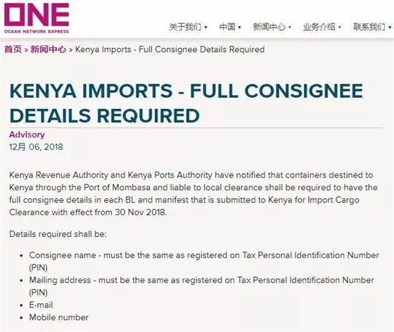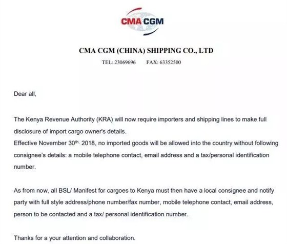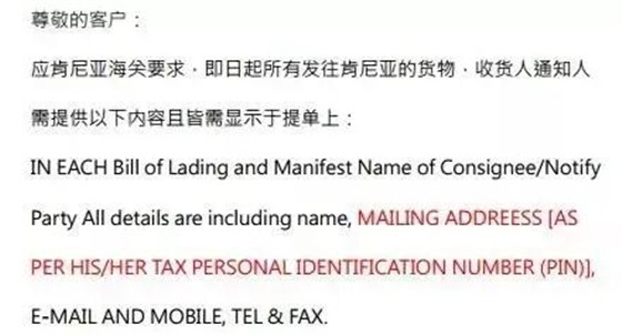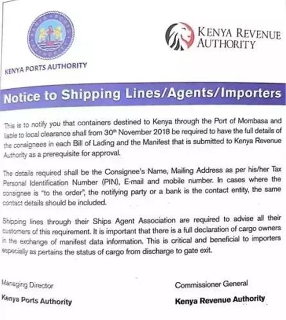 有出口肯尼亚的外贸、货代人请注意了!12月1日起,肯尼亚已正式施行了提单新规!根据肯尼亚海关的相关要求,所有通往肯尼亚的货物,在提单收货人、通知人一栏,必须完整填写以下信息:公司名、P.O. BOX、详细地址 (至少有城市及国名)、PIN NO、电话传真、手机、邮箱。青岛巨晖10年专业门到门、港到港一站式出口肯尼亚货代公司,经验丰富,能够为您制定高效、省心、更节省成本的进出口方案,诚信可靠,海关认可。