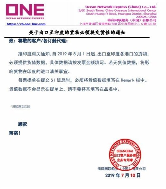 有出货印度的货代货主们注意了,由于印度将于8月1日起实施舱单新规(详情>印度执行海运舱单及转运新规,不符要求将无法卸柜),请大家出口至印度各港口的货物,务必提供货值数据,具体数据可按发票金额填写。若无货值数据,可能会影响货物在印度的进口清关事宜。