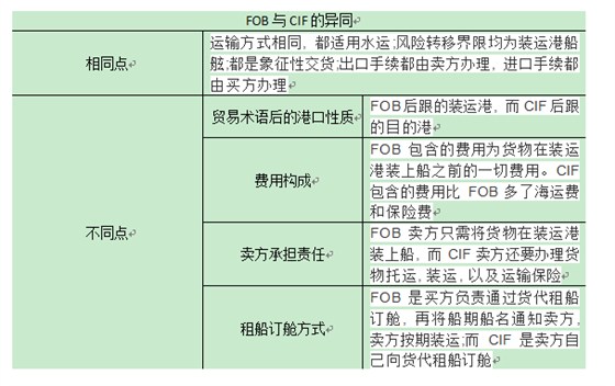 在了解了FOB和CIF相关基本内涵后,让我们来对比一下两者的不同和相同之处,并总结了如下表格: