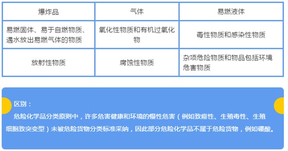 危险化学品分类原则中,许多危害健康和环境的慢性危害(例如致癌性、生殖毒性、生殖细胞致突变型)未被危险货物分类标准采纳,因此部分危险化学品不属于危险货物,例如硼酸。