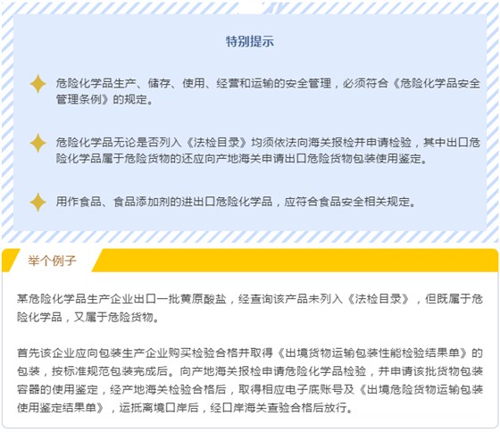 海关对进口危险化学品采取“口岸查验+目的地检验”的监管模式, 进口危险化学品的收货人或其代理人、出口危险化学品发货人或其代理人应当向海关报检并申请检验。