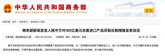 商务部新闻发言人就中方对160亿美元自美进口产品采取反制措施发表谈话
