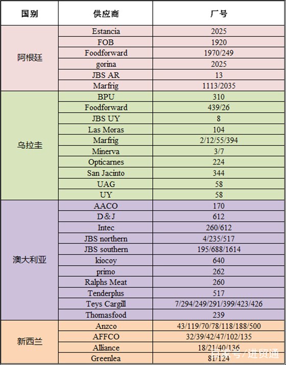 供应商是指各个国家中的肉类出口公司;厂号其实是各国屠宰分割厂的代码,只是以数字的形式标识。熟悉进口牛肉的人都知道,一般我们谈论某个部位肉的时候,都会说哪个厂的什么肉。这是因为,不同的厂号对于分割、修理的标准存在差异。一般来说,自然分割与精修(去膜、去筋、去脂肪)后的产品是不一样的,价格也会因此有差异。以下是各个国家的供应商、厂号对应情况,仅供目前阶段参考。