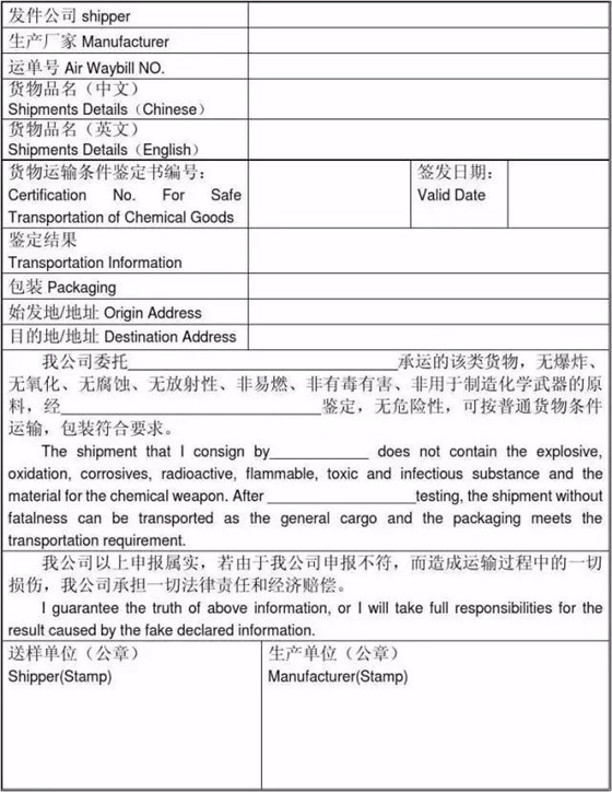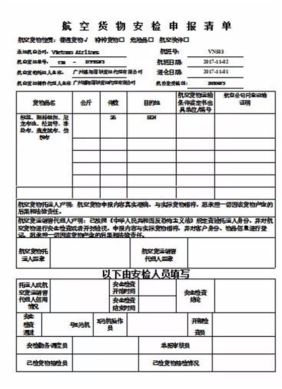 航空货物安检申报清单