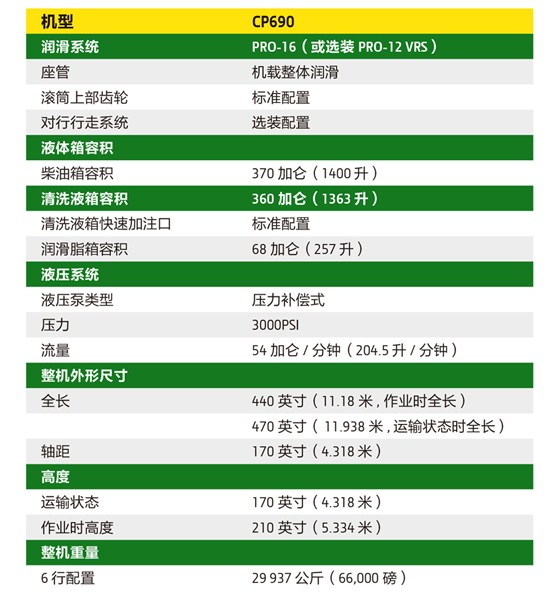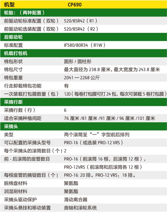 约翰迪尔CP690采棉机主要参数信息表: