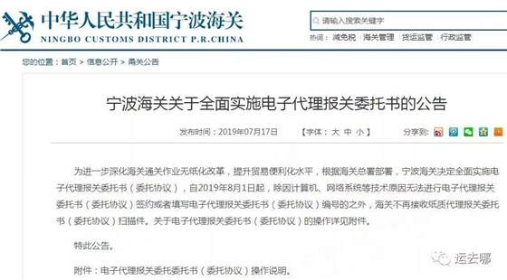 近日,各大海关关区发布通知,自2019年8月1日起,除因计算机、网络系统等技术原因无法进行电子代理报关委托书(委托协议)签约或者填写电子代理报关委托书(委托协议)编号的之外,海关不再接收纸质代理报关委托书(委托协议)扫描件。