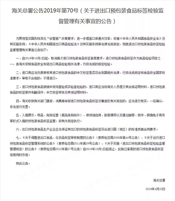 2019年10月1日起取消进口预包装食品标签备案(海关总署公告2019年第70号),公告对进出口预包装食品标签会有哪些规定呢?下面一起跟青岛巨晖国际物流小编一起来了解下。